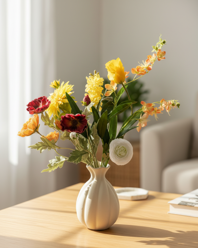 Each flower is handmade from high-quality materials and feels lifelike, with subtle color variations and natural shapes indistinguishable from real ones. This way, you enjoy the look of fresh flowers, but lasting.